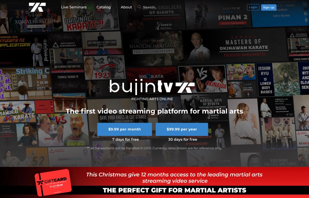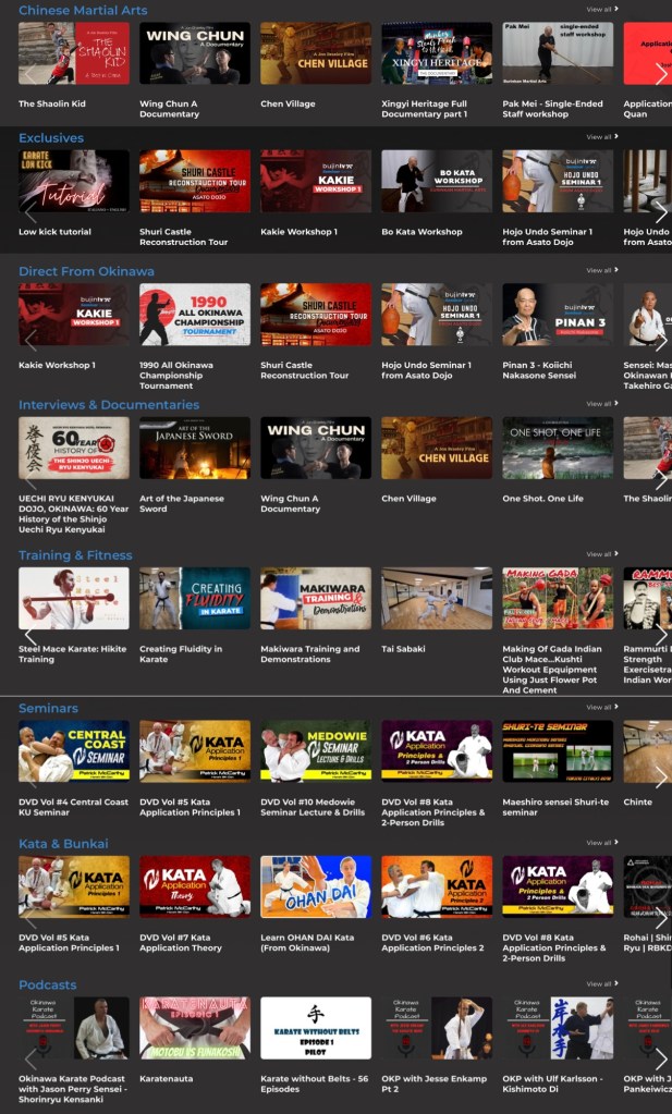 Con una gran selección de contenido de todo el mundo, con diferentes categorías, que van desde: contenido exclusivo de la plataforma, seminarios, kata y bunkai, podcasts, entrevistas, documentales, contenido desde Okinawa, entrenamiento, fitness, artes marciales chinas, y hasta películas.